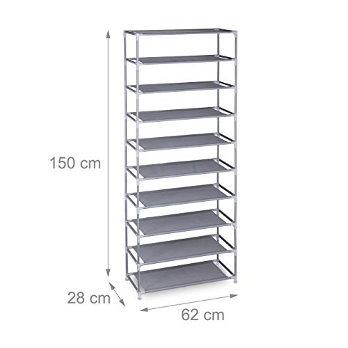 Product Description Home, Garden and Leisure Relaxdays features a large variety of creative goods with a focus on household, garden and leisure products. German brand A large variety of products Reliable and committed Styles for every taste 10 years' experience Black Shoe Organiser with 10 Levels This shoe rack is ideal for the hallway or stairwell. The 10 wide fleece shelves can hold up to 30 pairs of shoes, depending on size. The shelves, together with the minimalist beauty of the rack, fit into any interior. The simple plug-in system makes assembly easy. This construction can be extended or reduced as desired - the height can be adjusted according to your wishes. Total dimensions H x W x D: approx. 150 x 62 x 28 cm Dimensions of each level W x D: approx. 52 x 25 cm Distance between shelves: approx. 15 cm Ground clearance: approx. 3 cm Load capacity per level: approx. 3 kg Weight: approx. 1.9 kg Material: Iron, non-woven fabric, plastic Expandable Shoe Rack Depth suitable for women's shoes up to size 41 Stores sandals, trainers and ballerinas Space for up to 30 pairs of shoes on 10 floors - more room for children's shoes XXL Fabric Shoe Rack for 30 Pairs of Shoes Dimensions of the shoe rack in detail Simple, practical and easy to assemble without tools Height can be extended as required Included in Delivery 1x Shoe rack in individual partsIncludes assembly instructions and hardwareDecorative items are not included