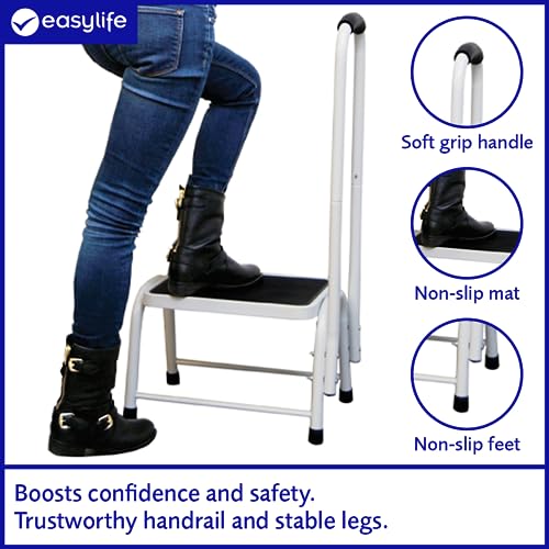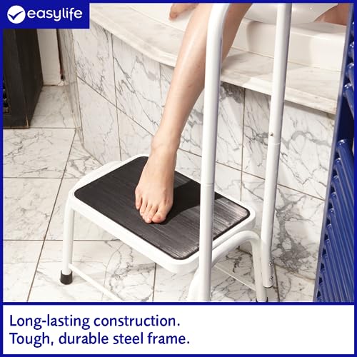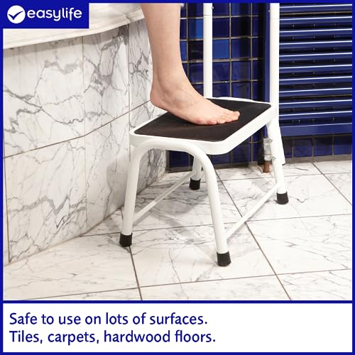 - STEP STOOL WITH HANDRAIL FOR EXTRA PEACE OF MIND - 12" (28cm) high with a 89cm comfy non-slip grip handle for better stability and sure-footed confidence with safety in mind for reaching cupboards, stepping out of the bath and changing lightbulbs