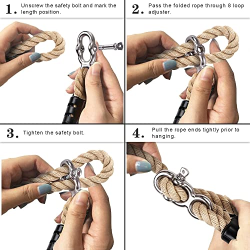 • EASY TO USE: Need't any other hardware, easily hang any swing to tree or play set. First: Hanging usage, just throw it over a tree or beam and attach the hooks to your swing or patio furniture; Second: Adjustable usage, open the safety clasp, pass the rope through the metal buckle, locked up then pull the rope ends tight.