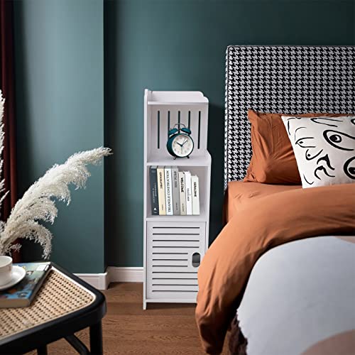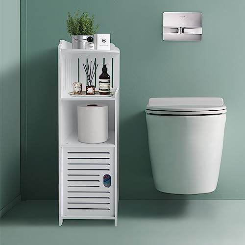 - Large Storage Space:This bathroom storage organizer has 1 door and 3 open shelves with different functions to provide large storage space.The top of the cabinet is open to hold mobile phones or small potted plant.The open shelves allow easy access to toilet rolls and cleaning supplies within reach. The bottom cabinet with door allows you to store store tall bottles or other tall items. There are large spaces to store various toiletries.