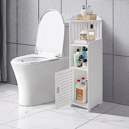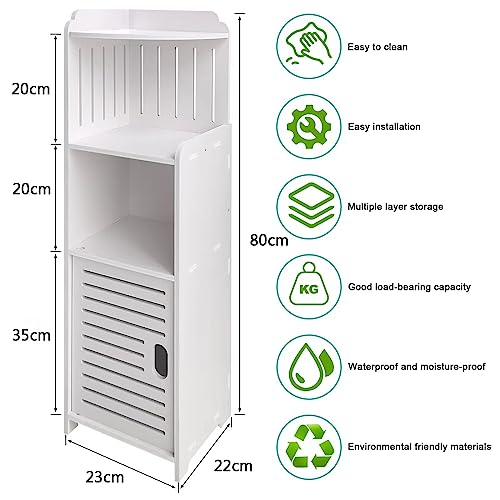 Product Description This bathroom storage cabinet is both functional and stylish.It offers you plenty of storage space while taking up little space. Toiletries on the up shelf, and spare towels and toilet paper in the middle cabinet, tall bottles or other tall items in the bottom cabinet. Cabinet is sturdy and attractive. Water-resistant material is suitable for humid environment, perfect choice to hold tissues,toilet rolls and cleaning supplies in your bathroom. Product Specifications: Color: White Material: PVC foam board Dimensions: 23x22x80cm(WxDxH) Weight: 6.6 Pounds Layers: 4 layers What's inside package? 1 set x Bathroom Floor Cabinet with Door 1 x Assembly accessories 1 x Assemble Manual