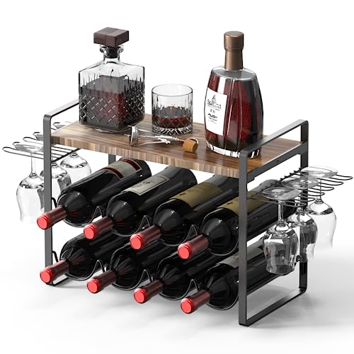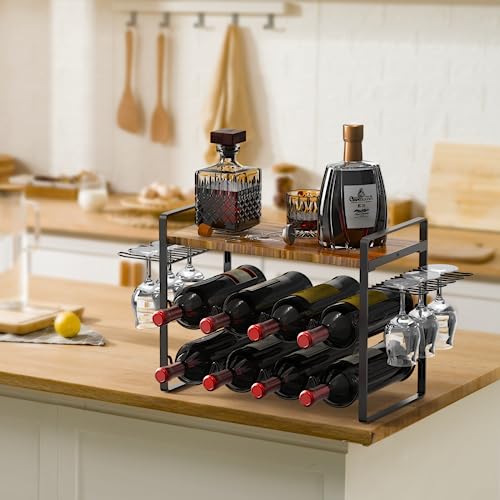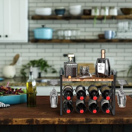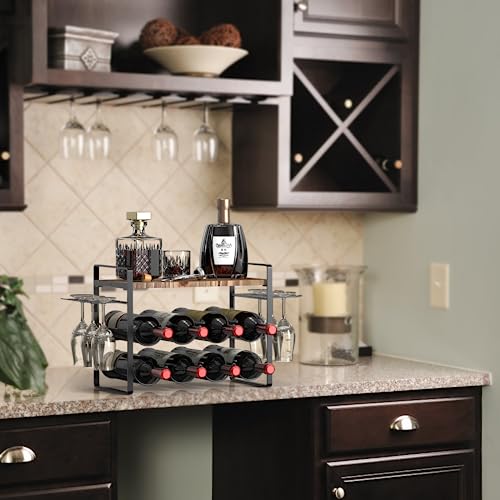 Shansis Wine Rack with Glass Holder - Metal Frame Wine Holder Stand - Solid Wood Top Wine Storage - Wine Racks Countertop for Kitchen or Home Bar