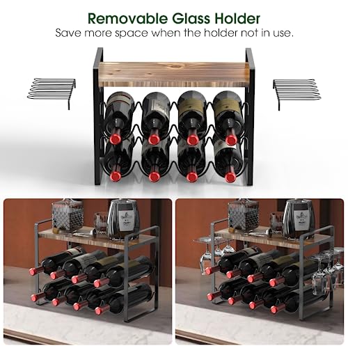 • 【Elegant and Practical Design】This countertop wine rack features a metal frame with a solid wood top that can store wine accessories such as wine bottle openers, glasses or add some decor. The wine glass holders are removable and can save more space when not in use. The sleek and vintage design adds a touch of modern elegance to your kitchen or home bar.