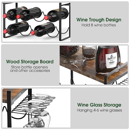 Home Dining Room Furniture Shansis Wine Rack with Glass Holder – Metal Frame Wine Holder Stand – Solid Wood Top Wine Storage – Wine Racks Countertop for Kitchen or Home Bar