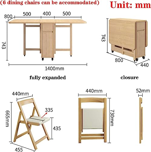 - 【Space Saving】1.4m folding table with 1 storage drawers;6 solid wood folding chairs can be stored in the middle. folds down and out of the way when not needed. Ideal for kitchen, dining room, office, studio, etc. It can be used as a computer desk when expanded and a cabinet when folded.
