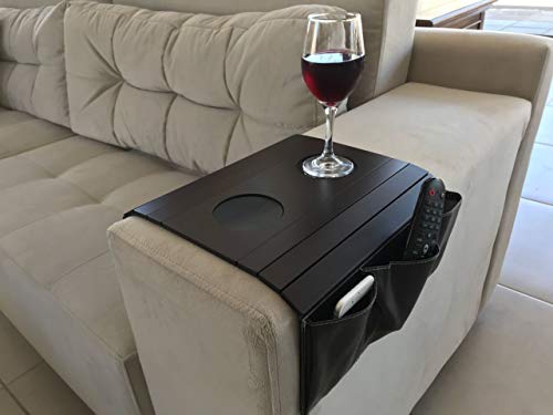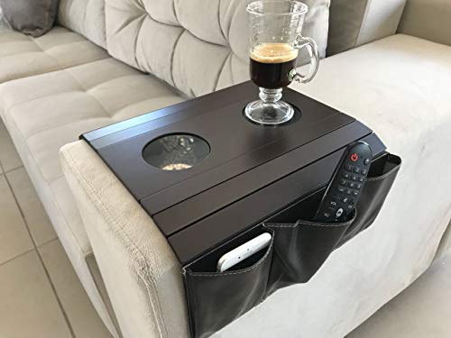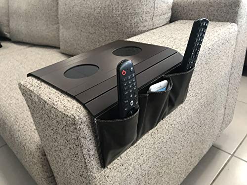 - 2 Drink Holders plus 3 Pocket Organizers. You can use it to organize your favorite TV accessories. Easy access to your drinks, snacks, phones, remote control, glasses and everything you need to have handy without having to get up!