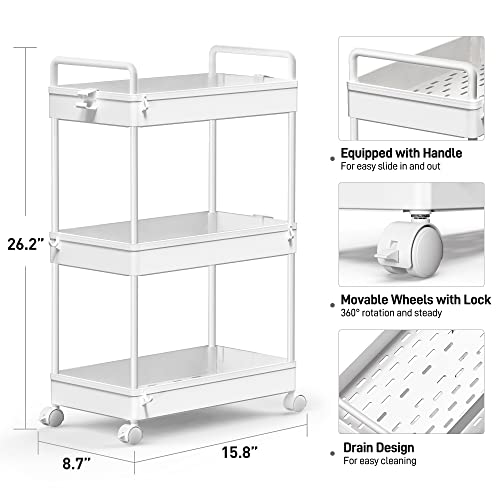 - 【Flexible & Widely Used】The 3-tier storage trolley is perfectly design for narrow-place utilization. The mobile shelving unit easily slides between closets, kitchens, bathrooms, garages, laundry rooms, offices, dorms, libraries or or in-between washer and dryer. Easy to store and transport. Size: 22 x 40 x 61 cm.