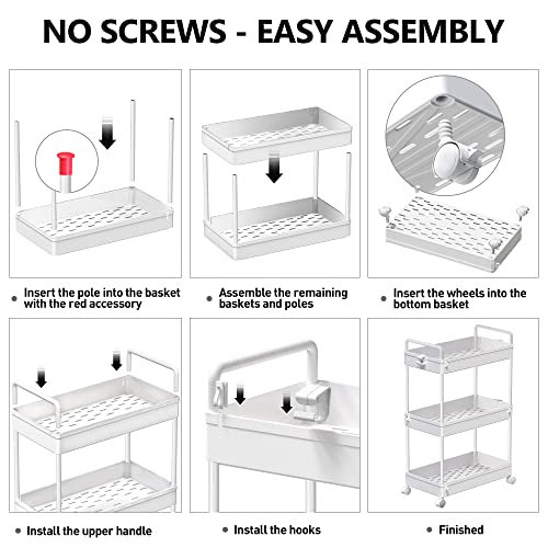 - 【Durable & Steady】The storage cart is made of high-grade plastic and stainless steel poles. 4 lockable universal rollers and handle design makes it easy to slide and stop stably at any places you want. It helps optimizing the space utilization as much as possible. Mesh shaped basket racks are ideal for easy washing and cleaning.