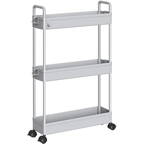 - 【Flexible & Widely Used】The 3-tier slim storage trolley is perfectly design for narrow-place utilization. The mobile shelving unit easily slides between closets, kitchens, bathrooms, garages, laundry rooms, offices, dorms, libraries or or in-between washer and dryer. Easy to store and transport. Size: 13 x 40 x 61 cm.