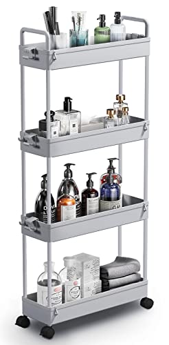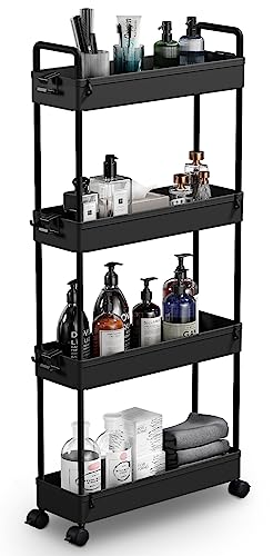 - 【Flexible & Widely Used】The 4-tier slim storage trolley is perfectly design for narrow-place utilization. The mobile shelving unit easily slides between closets, kitchens, bathrooms, garages, laundry rooms, offices, dorms, libraries or or in-between washer and dryer. Easy to store and transport. Size: 13 x 40 x 86.3 cm.