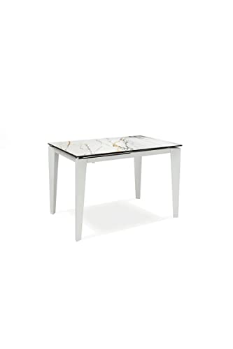 Product Description Extendable table up to 170 cm, high quality. The table arrives on pallet consisting of 2 packs. In the first package there is the Top, well protected and well packaged. In the second package there are metal legs, 4 pieces, and screws for assembly. Once the table is assembled, it must be placed and then, if necessary, you can adjust the extension very easily. The table weighs 68 kg. The top of the table is white marble. The table legs are white in color. Independent single extension that allows you to stretch the table from 120 cm to 170 cm. The stretch, easy to extract, is 50 cm. Table top consisting of 8mm tempered glass with over 5mm white marble color ceramic. White Marble Ceramic Top Detail Ceramic Top Detail of Ceramic Top composed of 8 mm tempered glass and 5 mm white marble ceramic Independent single extensions Easily removable single extender. It is extracted independently with a system of intelligent guides Extendable table up to 170 cm The table has the following measurements, from 120 cm to 170 cm fully open. Width 80 cm and height 76 cm, the extension is 50 cm Extendable Table 170 cm Top in Ceramic on Tempered Glass Graphite Grey Extendable Table 240 cm Top in Ceramic on Tempered Glass Graphite Grey Extendable Table 170 cm Top in Ceramic on White Tempered Glass Extendable Table 170 cm Top in Ceramic on Tempered Glass White Marble Extendable Table 170 cm Top in Ceramic on Tempered Glass Anthracite Marble Extendable Table 170 cm Top in Ceramic on Tempered Glass Portoro Single Extension ✓ ✓ ✓ ✓ ✓ ✓ Color Top Graphite Grey Graphite Grey White White Marble Anthracite Marble Portoro Extendable from 120 cm to 170 cm ✓ ✓ ✓ ✓ ✓ ✓ Color Legs Anthracite Anthracite White White Anthracite Anthracite 6 people ✓ ✓ ✓ ✓ ✓ ✓