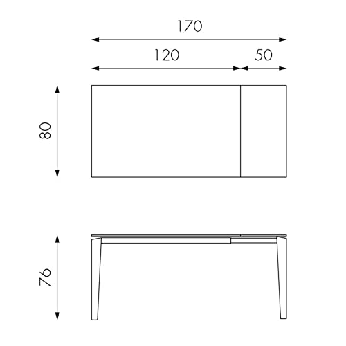 • Extendable table from 120 cm to 170 cm. Top width: 80 cm. Height: 76 cm. Top thickness: 5mm ceramic on 8mm tempered glass. Net weight: 68 kg