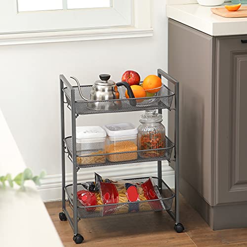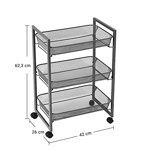 - WHAT YOU GET: A 42 x 26 x 62.3 cm super practical rolling cart with three 41.2 x 27 cm wire baskets in which you can neatly store food, toiletries, toys, towels, and many other items