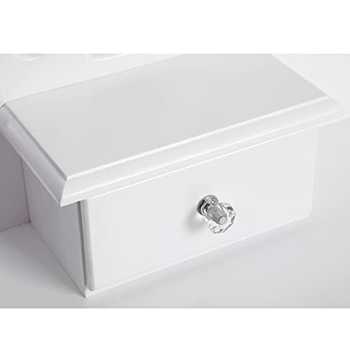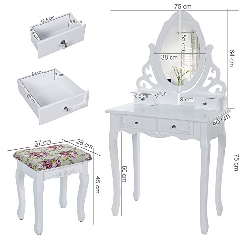- Dressing table dimensions: 75 x 139 x 40 cm (W x H x D), stool dimensions: 37 x 45 x 28 cm (W x H x D). Note: For safety, please attach the product to the wall with the included tilt protection