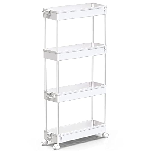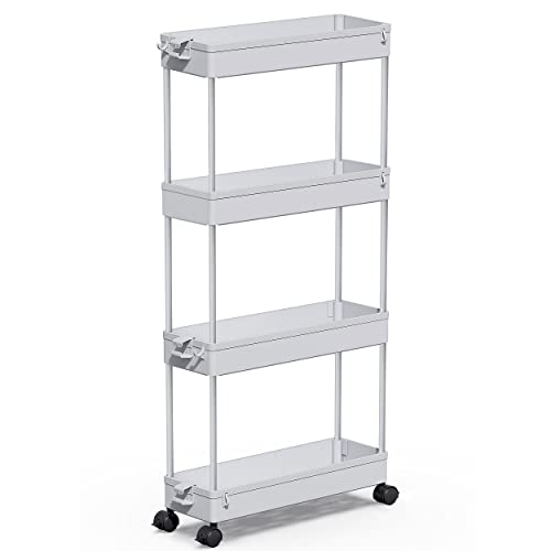 - 【Large Capacity & Flexible】The 4-tier slim storage trolley cart is designed perfectly for tight space utilization at home. This rolling storage cart is ideal for closet, kitchen, bathroom, garage, laundry room, office, dorm, libraries or in-between your washer and dryer. Easy to store and transport. Size:13 x 40 x 86.3 cm.