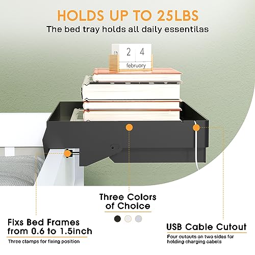 - Quick installation in 30 seconds: No tools required! Simply hook the tray to the side of the bed frame and screw in the three screws on the back of the tray until it is firmly attached to the bed frame. The bedside tray can be locked and the maximum bed frame side rail width is 4 cm or 1.5 inches. Minimum width 1.5 cm or 0.6 inches. Please measure the side length of the bed frame to make sure it fits properly.