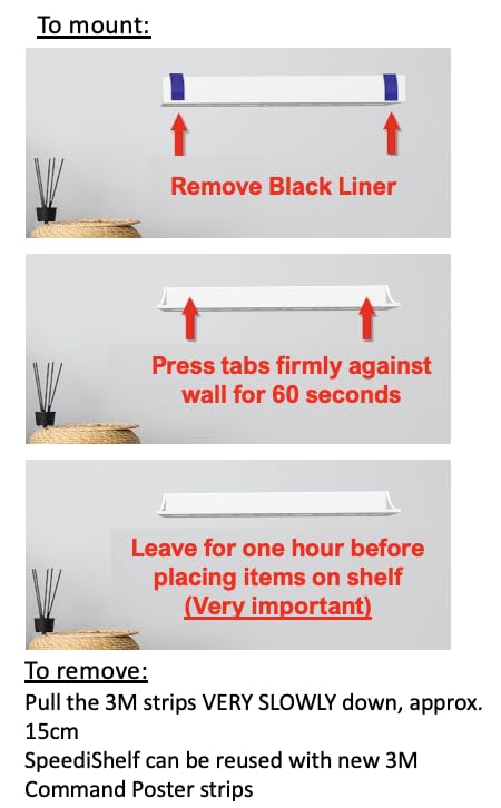 - SpeediShelf requires no screws, it is secured to the wall in 60sec with two 3M Command Strips (supplied)