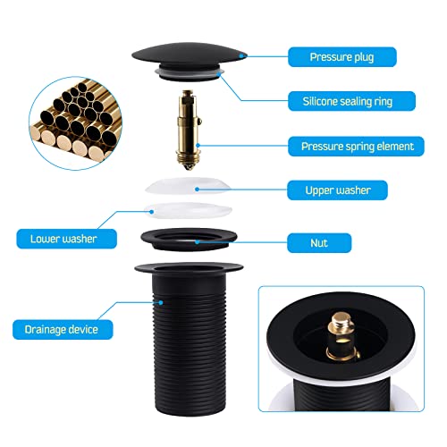 - 【Pop Up Slotted Design】Bathroom sink waste black without overflow design, brass bouncing cores have good bounce and rebound strength, quickly seal and drain water with a single press, easy to operate and cleaning.