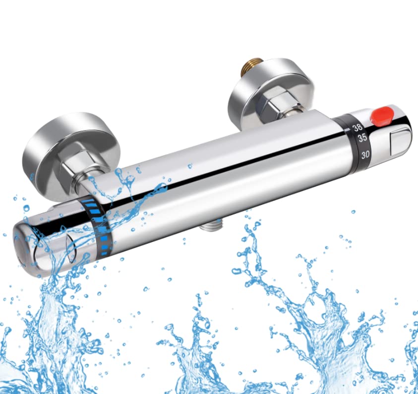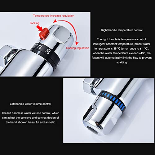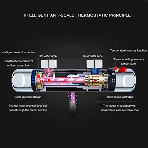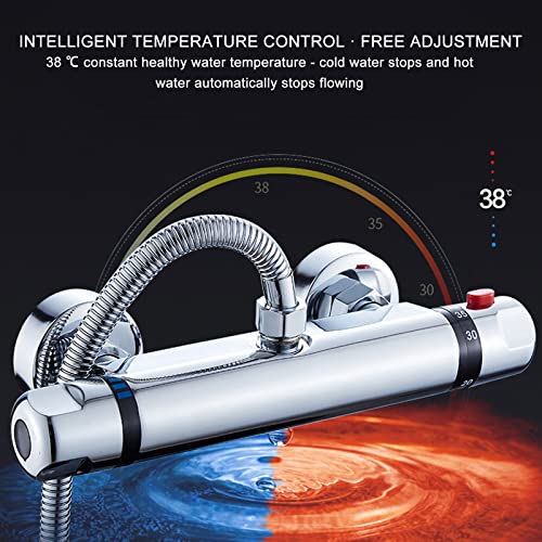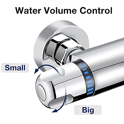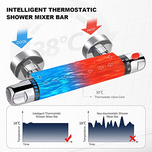 - [INTELLIGENT TEMPERATURE CONTROL]This thermostatic shower mixer valve can set the temperature you want in advance according to the rotary button on the right, there is no need to adjust the water temperature manually. Meanwhile, the red button can lock the constant temperature of 38° with one button, you can choose the higher or lower temperature according to your need