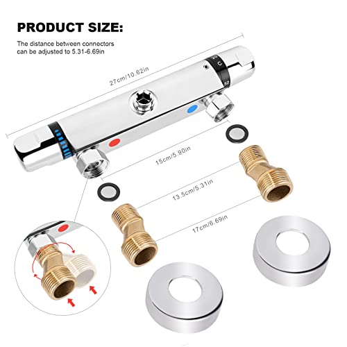 - [EASY TO INSTALL]This thermostatic bath shower mixer comes with detailed installation instructions and drawings so you can know the installation steps at a time. The hot water connection is on the left, the cold water connection is on the right, and the lower outlet size is G1/2.