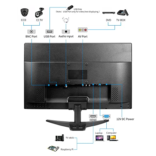 - [PC Monitor with Multiple Port] have HDMI, VGA, AV, BNC, 3.5mm Audio Input/Output and USB. This Security Monitor comes with 2 built-in speakers. With built-in USB port and media player. It can play movies or videos simply by USB disk. Great for Home/Office/Store Surveillance Camera and Other Video Equipments.