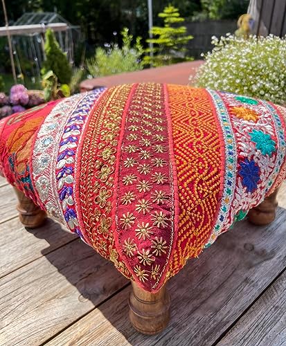 - The multi coloured low diagonal patchwork stool is upholstered in an assortment of fabrics and patterns and features carved mango wooden legs.