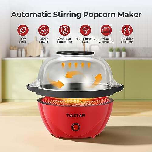 - 【Electric Stirring】As the machine powers on, the detachable motorized stirring rod starts rotating gently, creating a continuous motion within the hot air chamber to make the popcorn heat evenly, resulting in better popping performance of popcorn pop rate to 98% in 3-4 minutes, creating crisp popcorn but doesn't burn.