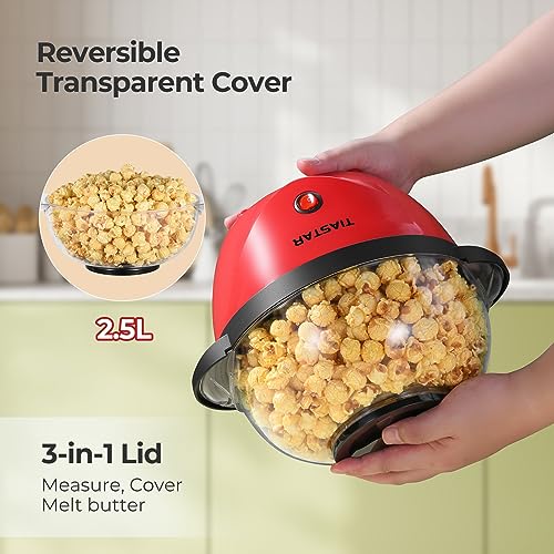 - 【Special Design】The vents of cover effectively release the excess heat generated during the popping process, preventing any moisture buildup to become delightfully crisp and crunchy. The anti-scald handle stays cool to the touch even during operation. The transparent cover allows you to witness the magical transformation of kernels into fluffy popcorn. With a simple flip, it can be used as a serving bowl. The popcorn maker has prioritized both your safety and the quality of the final product.