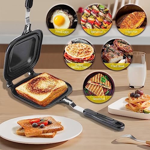 - 🍰【FAMILY BREAKFAST MAKER】--- The heat resistant handle is comfortable and non-slip, making it easy to flip your pan, Non-Stick Stovetop Toastie Maker perfect for making sandwiches, breakfast, grilling, frying, roasting, baked potatoes, slow-roasted vegetables, steak, fish, fajitas, bacon, frittatas, grilled chicken, seafood, meat, vegetables and more.