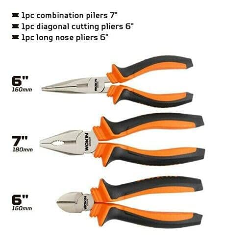 - Three types of pliers: 7" Combination Pliers, 6"Diagonal Cutting Pliers, 6" Long Nose Pliers. You can work precisely and flexibly in tight spaces. The jaw gap of the Combination Plier is serrated. The clamping jaw is not easy to slip and improves safety performance.