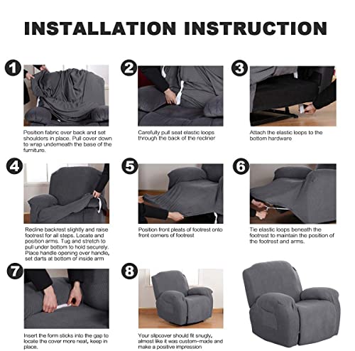 • 【Recliner Chair Cover Perfect Fit】1 Seater recliner cover is made to fit perfect most single seat recliners. Velvet recliner chair cover consists of 4 separate parts, including 2 arm cover, 1 seat cover and 1 backrest cover, so even with a recliner chair cover, you can open the recliner. The high stretch fabric of the recliner cover can make the cover easy to adjust and better fit. To make your recliner chair cover fit better, please measure your recliner chair before buying