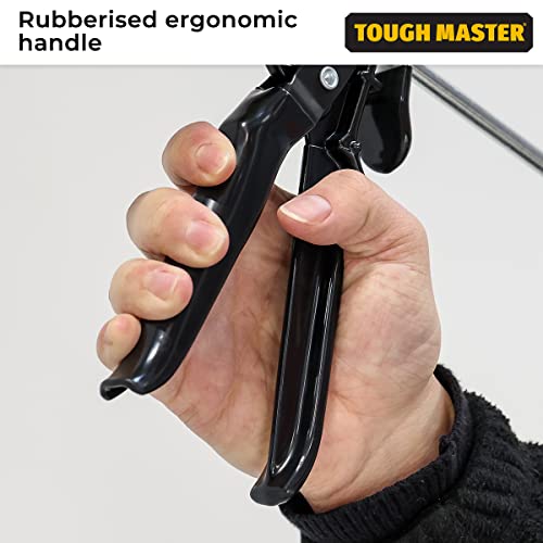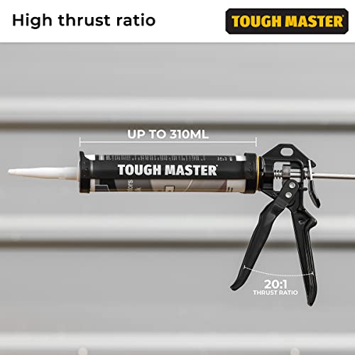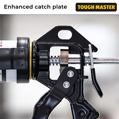 Product Description Product Description: ALL ABOUT TOUGH MASTER At TOUGH MASTER, we offer a comprehensive portfolio of tools, work wear, and accessories for professional tradespeople. Since our start-up in 2015, we’ve steadily gained a reputation for industrial-grade and top tier products. TOUGH MASTER ROTATING FRAME CAULKING GUN Caulking Gun The Caulking Gun has a working platform that creates pressure up to 2500 N. It has a high thrust ratio of 20:1 for easy squeezing and reduced fatigue. Suitable for cartridges with up to 310ml content and highly durable, it also has a rotating cradle barrel for easy maneuverability. With a comfortable rubberised grip and ladder hook for a great storage solution. Benefits Enhanced catch plate The working platform creates pressure up to 2500N, providing comfortable working conditions when using the caulking gun, even with thick mixtures. The smooth movement of the pressure rod requires little effort during operation. High thrust ratio With a power transmission ratio of 20:1, you can squeeze the sealant with minimal effort and reduced fatigue. The professional caulking press is suitable for cartridge sizes up to 310ml, so can be used with all standard sealing and adhesive cartridges. Heavy duty materials The sealant gun has a heavy duty metal barrel, handle, rod, plate, and is treated with a premium finish, enhancing the durability of the tool and ensuring it can withstand the toughest environments and last for years to come. 360° rotating barrel For easy maneuverability in and around tight spaces, this adhesive application gun has a rotating cradle barrel, which also gives you professional results and means you have ultimate control when using the caulk gun. Rubberised ergonomic handle An ergonomic rubberised handle with a non-slip design offers ease and comfort as you operate the best caulking gun. This not only reduces hand strain but also prevents accidents since it is less likely to slip out of your hands during use. Ladder hook Hang your caulking tool with comfort grip on a ladder using the ladder hook when it's not in use. This provides a great storage solution and means you can get back to it easily and conveniently once you require it again.