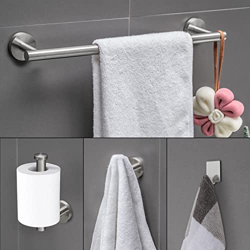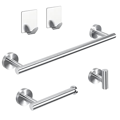Product Description HotSan Bathroom Accessories Set - Stylish Wall Mounted Hardware for Updating Your Home ! Right up there with our bedrooms, the bathroom should be viewed as a sanctuary. It's where we start and end each day - preparing, unwinding, relaxing, taking care of yourself. So we should choose all the accessories consciously to ensure a tidy and comfortable bathroom for us and our family. For an elegant look of our bathrooms or kitchen - we have to take care of every detail like the towel bar, robe hook and tissue paper holder along with the major accessories (bathtub, shower, commode). Stylish Designed Wall Mounted Stainless Steel Bathroom Accessories The bathroom accessories set is made of SUS304 stainless steel that provides it high quality while ensuring that it lasts for decades. Each of the pieces within the set has a cool round design that is ultra modern, which will update the look of any bathroom. 5 in 1 Bathroom Accessories Kit 1 x 12" Brushed Hand Towel Bar1 x Brushed Toilet paper holder1 x Brushed Robe Hook2 x Metal Hooks8 Mounting screws & 8 wall anchors3 L Tools drill-bit size 6mm Easy to install - concealed Screws wall mounted installation The mounting screw also comes with wall anchors so you can mount it where you want.You can install it yourself and all the drilling instruments work properly.The towel bar or robe hook can be a useful product for your kitchen when you have limited space for a hand towel bar.This towel bars kit fits easily in the bathroom, bedroom, or in kitchen.You will never go wrong with its durable, yet fashionable finish. Perfect bathroom accessories for any style Keep Your Towels Dry and Within Reach 12-inch hanger perfectly holds 2 folder towels.You can hang the towel bar even on a very narrow wall. Streamlined Towel Robe Hook This towel hook is exactly the kind of bathroom detail that looks to be relatively minor on the surface but really helps to tie in entire room together. Open-armed Toilet Paper Roll Holder Tissue holder fits the majority of paper roll sizes and has an arm length of 5.2 inches.The toilet paper holder is sturdily attached to the wall and rolls freely.Ideal for bathrooms with small space