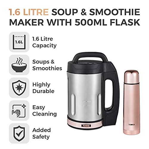 From the manufacturer Our brand’s strength comes from its heritage – something that can’t be forged and something that allows us to continue offering highly desirable housewares products to a wide customer-base with unshakable brand loyalty. Quality, Innovation and Value. Customers' Trusted Brand Healthy Cooking for Decades Desirable Electrical and Housewares Products Tower T12055RG Soup Maker with Intelligent Control System and Stainless Steel Jug and Blade, Includes 500ml Flask, 1000W, 1.6 Litre, Rose Gold This Tower soup maker is a quick and easy way to make a nice healthy soup for lunch or dinner for you and the whole family, with a 1.6 litre capacity serving up to 4-6 portions. Quiet in its operation, the stainless steel blade and powerful 1000W heater both blends and heats vegetables or other ingredients, allowing you to effortlessly produce smooth or chunky soup, and even baby food for ultimate versatility. The LED control panel offers an easy to use interface, letting you choose your desired settings at the touch of a button. Includes a 500ml flask for taking to work or a day out hiking. This Tower soup maker is a quick and easy way to make a nice healthy soup for lunch or dinner for you and the whole family, with a 1.6 litre capacity serving up to 4-6 portions. 1.6L capacity makes 4-6 portions Blends and heats ingredients in one handy appliance Perfect for chunky soup / smooth soup / baby food for added versatility Stainless steel jug and blade for added durability LED control panel for ease of use Intelligent control system to prevent burning for added safety Includes 500ml flask for travelling 1.6 Litre Capacity Provides enough space to make up 4-6 portions of delicious soup for you and all the family to enjoy All-In-One This soup maker both blends and heats your ingredients for added convenience and efficiency Flask Included Includes a 500ml mask, making it perfect for taking to work for lunch or a day out hiking