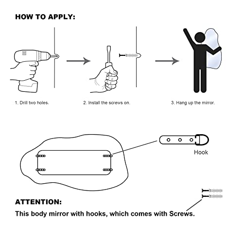 - Easy Installation: This body mirror with hooks, which comes with Screws. Just drilling 2 holes, install the screws on , hang up the mirror.