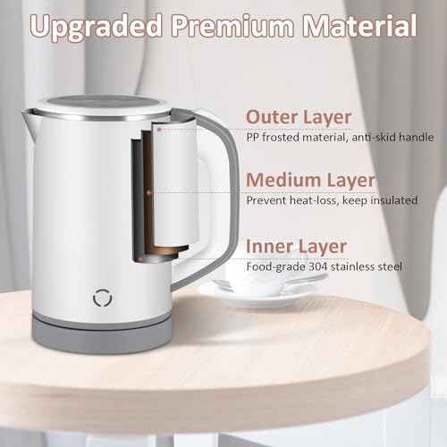 - 【Upgraded Premium Materials】Electric kettle adopts a double-layer design. The inside of the small kettle is made of 304 safe stainless steel, with no Teflon or other harmful substances,brings you healthier water. The outside is covered with a high-temperature resistant PP material, so it can effectively reduce heat transfer and prevent you from scald.