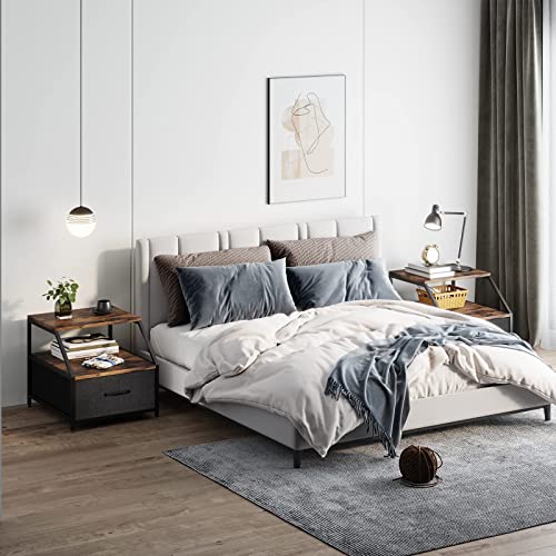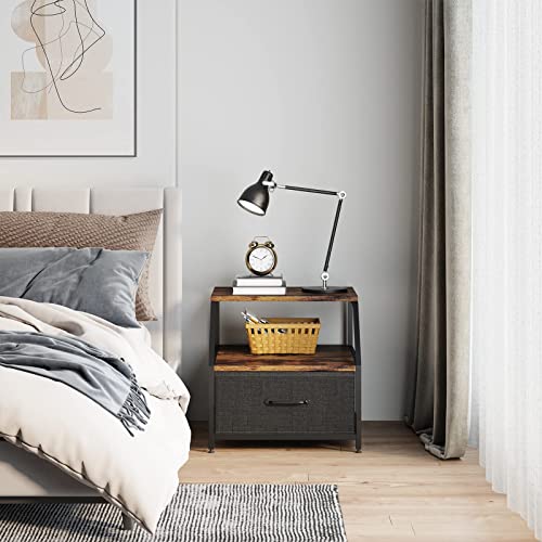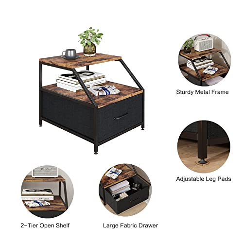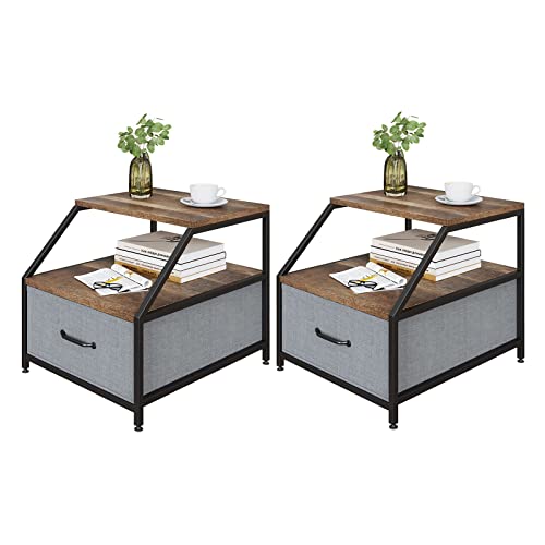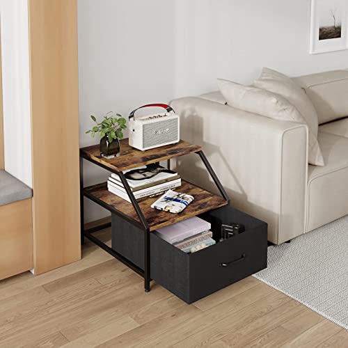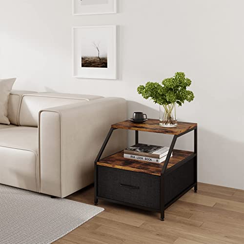 TREETALK Side Table, Industrial End Table with Oblique Angled Storage Shelf, Fabric Drawer and Adjustable Leg Pads,Nightstand Beside Table for Li