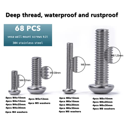 - 【Universal Hardware Kit】The pack includes all the hardware for mounting virtually all TVs up to 85’’ TVs. 68pcs in total includes 8pcs M4x10mm bolts and 4 each of the following screws and washers:The screws come in M4 x 12mm,M4 x 25mm,M4 x 30mm, M5 x 12mm,M6 x 12mm,M6 x 16mm,M6 x 20mm, M6 x 30mm, M8 x 16mm, M8 x 20mm,M8 x 30mm.vesa washers come in M4,M5,M6 and M8. That means no more mount compatibility issues with your TV.