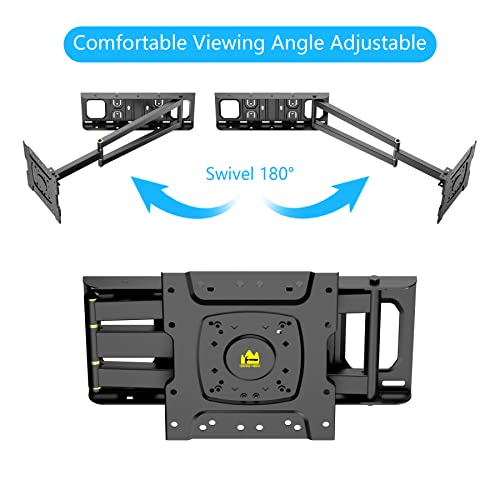 - Fully movable: The long reach TV wall bracket can be adjusted by +/- 3 degrees to achieve a horizontal TV angle, tilted 5 degrees up and 10 degrees down to reduce glare, and swivels 90 degrees right and left to achieve the optimal comfort and viewing position for the TV viewer