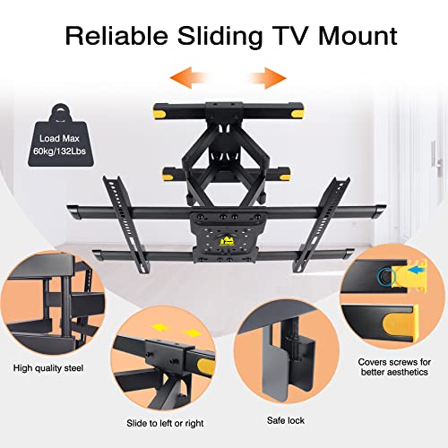 - Fully movable: The long reach TV wall bracket can be adjusted by +/- 3 degrees to achieve a horizontal TV angle, tilted 5 degrees up and 10 degrees down to reduce glare, and swivels 60 degrees right and left to achieve the optimal comfort and viewing position for the TV viewer