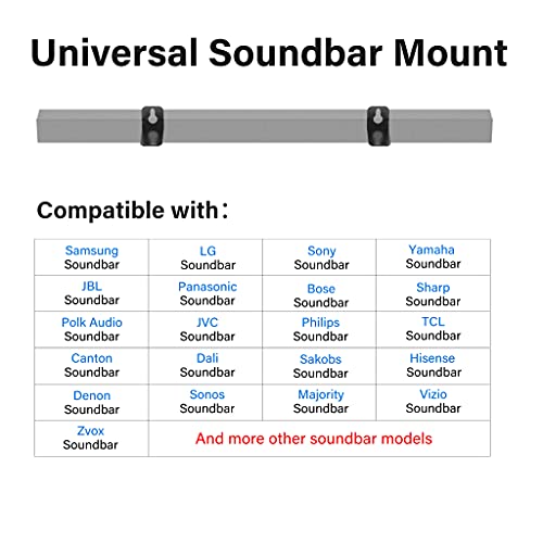 - Universal Sound Bar Mounts ----- Soundbar mounting bracket fit for most of soundbars, such as compatible with Samsung, Bose, LG, Sony, Sharp, Denon, JBL, Panasonic, Philips, JVC, Hisense, TCL, Majority, SAKOBS, Canton, Dali, Polk Audio and more soundbars; The max width that can fit the soundbar is 5.12"and weight capacity up to 30 lbs.