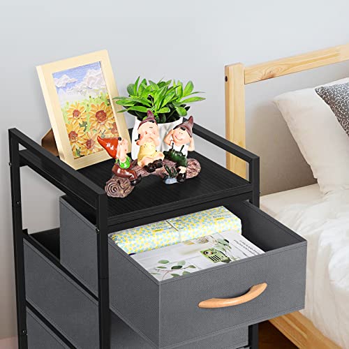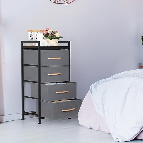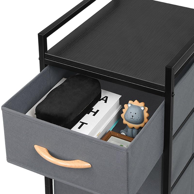 Product Description UOMIO Grey Chest of 4 Drawers for Bedroom Fabric Storage Drawers with Metal Frame Our 4-tier grey fabric chest of drawers with 4 wheels, an MDF wooden top, and a metal frame is a practical and versatile storage solution for your bedroom.The chest of drawers features four levels of spacious drawers, all covered in a soft and durable grey fabric. The grey color adds a touch of sophistication and complements various interior styles.The chest is equipped with wheels, allowing for easy mobility and convenient placement in any room.The top of the chest is made of sturdy wood, providing a durable surface for additional storage or display opportunities.The metal frame ensures stability and durability, making the chest of drawers a reliable piece of furniture. With its multiple compartments and large capacity drawers, it offers ample storage space for clothes, accessories, or household items.Overall, this 4-tier grey fabric chest of drawers combines functionality, style, and mobility, making it an excellent choice for organizing and enhancing your living space. Black Wooden Top Grey Fabric Drawers Wooden Handle Lockable Wheels & Adjustment Feet