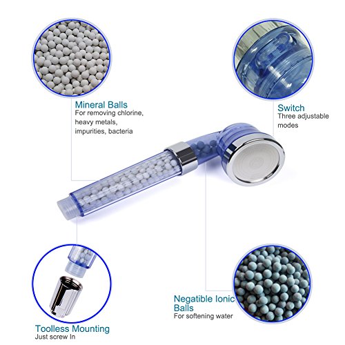 • 1). PURIFY AND SOFTEN WATER: Ionic shower head contains bioactive mineral balls and negative ion ball for removing chlorine, heavy metals, impurities, bacteria, softening shower water to eliminate dry, flaky skin and reducing oil secretion and increasing cell viability.
