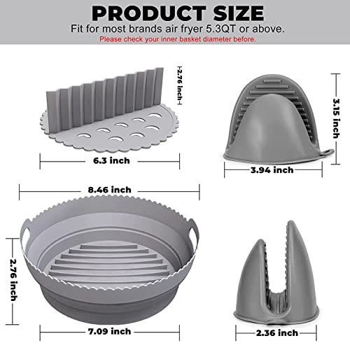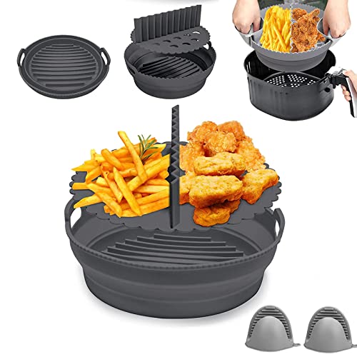 • [3 in 1 set Air Fryer Liners Pot] — 3 in 1 set including foldable basket and detachable divider with 2 insulated silicone gloves to protect your hands from burns. Suitable for the most of air fryers, Oven and Microwave.