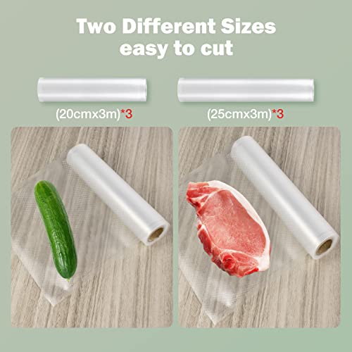 • Two Different Sizes: Our vacuum food sealer bags have 2 different sizes: 3 rolls of 20*300cm, 3 rolls of 25*300cm , which can meet your your various foods Storage is not only convenient, but also does not cause waste, to meet your different needs.