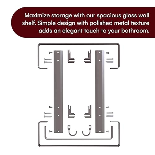 - [Huge Storage Space] This large glass wall shelf transforms the wasted space into a spacious storage area. Simple and clean lines paired with polished metal texture, this shelf will also give a touch of elegant to your bathroom. 10.8 inches distance between two shelves. Great for big volume shampoo. The overall dimensions is 15.2 x 5 x 16.1 inches.