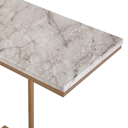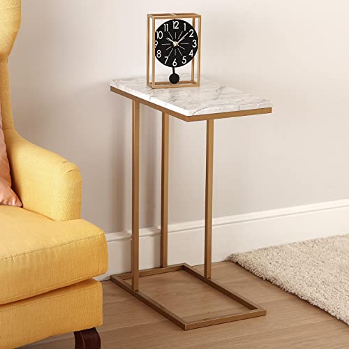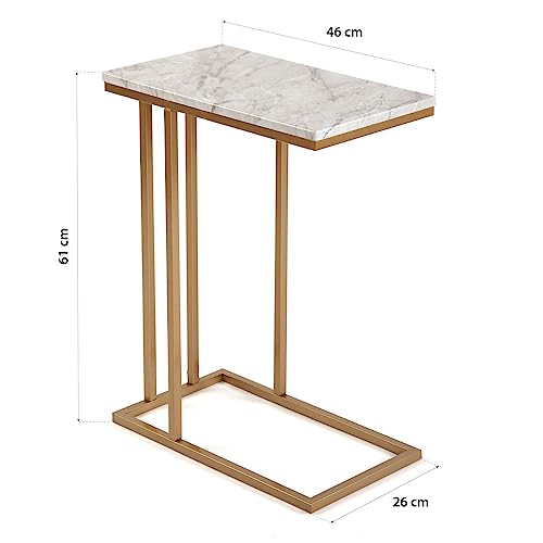 - FEATURES - The side table is the perfect size for the living room, bedroom or dining room. The table has a height of 61 cm, with a length (bottom) of 26 cm, and a width (side to side) of 46 cm. The weight is 5.6 kg and is made of chipboard (not real marble) and covered with melamine and metal. Colour: white marble countertop and gold legs.