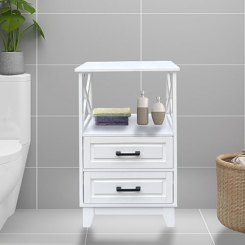 • 💡【Multi-functional design】: This bathroom cabinet is equipped with two drawers and an open shelf, which is a perfect way to get extra storage space in your bathroom. You can organize different items such as cosmetics, toiletries, towels, and toilet paper, making your items organized and keeping your bathroom tidy and orderly.
