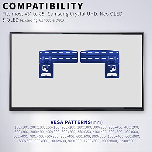 - Designed for Samsung Neo QLED TVs - This ultra-slim mount is designed for 43” to 85” 2021 Samsung Neo QLED, QLED (excluding AU7000 & Q80A), Crystal UHD, and The Frame TVs with VESA 150x100mm to 1200x800mm mounting capability.