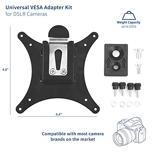 - UNIVERSAL DESIGN - This innovative adapter bracket makes it possible to attach a camera (works best with smaller cameras) to your compatible VESA mount. Fits a variety of mounts and stands using standard VESA 75x75mm and 100x100mm. Features 1/4 and 3/8 camera mounting.